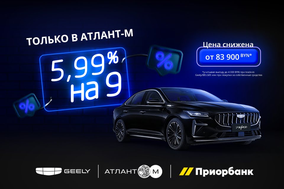 Geely Атлант-М в сотрудничестве с ОАО «Приорбанк» предоставляет уникальное предложение со ставкой 5,99% годовых в льготном периоде.