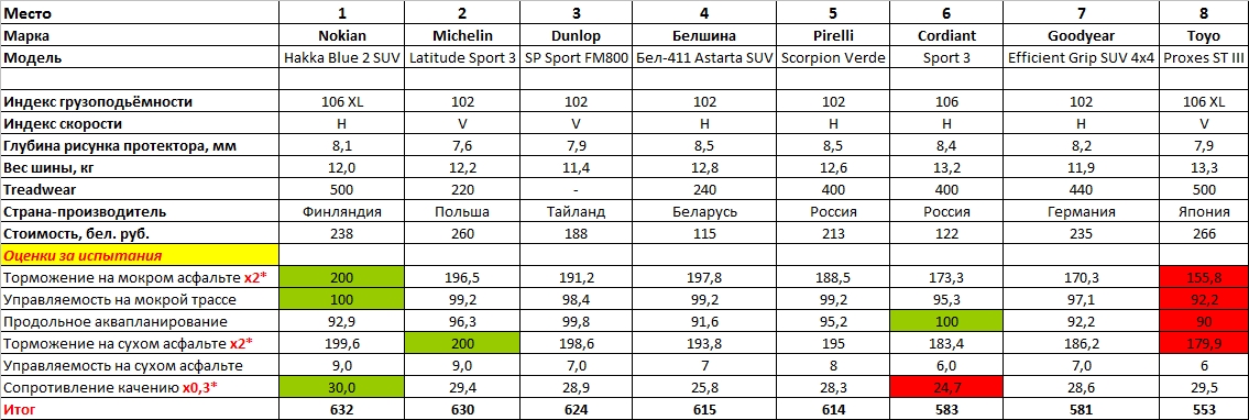 Полный список протестированных летних шин: Nokian Hakka Blue 2 SUV, Goodyear Efficient Grip SUV 4×4, Michelin Latitude Sport 3, Dunlop SP Sport FM800, Belshina BEL-411 Astarta SUV, Pirelli Scorpion Verde, Cordiant Sport 3, Toyo Proxes ST III. В качестве автомобиля-носителя выступили кроссоверы Volkswagen Tiguan первого и второго поколений.